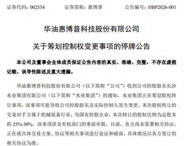 1月8日晚间,惠博普披露公告称多赢策略,公司控股股东水业集团正筹划股权转让,转让股权比例为总股本的25%-30%,该事项可能导致公司控股股东及实控人发生变更,公司股票自2026年1月9日起停牌,预计停牌时间不超过2个交易日。